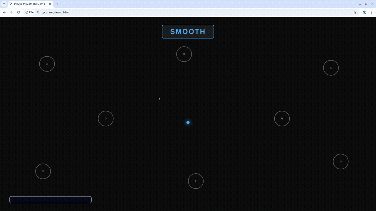 Move the cursor to specific screen coordinates. By default, the cursor follows a human-like Bezier curve path instead of teleporting instantly. You can control this withsmooth and duration_ms.